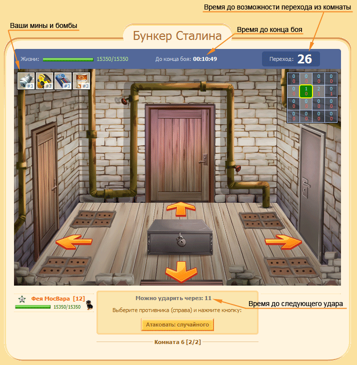 В ходе боя игроки могут: атаковать противников, перемещаться из комнаты в комнату и использовать бомбы и мины. Перемещаться между комнатами и атаковать противников игрок может раз в 30 секунд, но эти действия не связаны, т.е. игрок может перейти в комнату и через секунду атаковать противника, но перейти в другую комнату, он сможет уже только через 30 секунд.